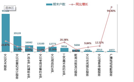 从文化及其相关产业的行业分布情况看,企业期末户数排名前三位的是文化艺术服务类企业、文化创意和设计服务类企业、文化产品生产的辅助生产类企业,合计占全市文化及相关产业企业总户数的75.95%。其中,文化艺术服务类企业期末户数95,928户,同比增长22.87%;文化创意和设计服务类企业期末户数39,139户,同比增长11.30%;文化产品生产的辅助生产类企业期末户数16,042户,同比增长9.97%。
