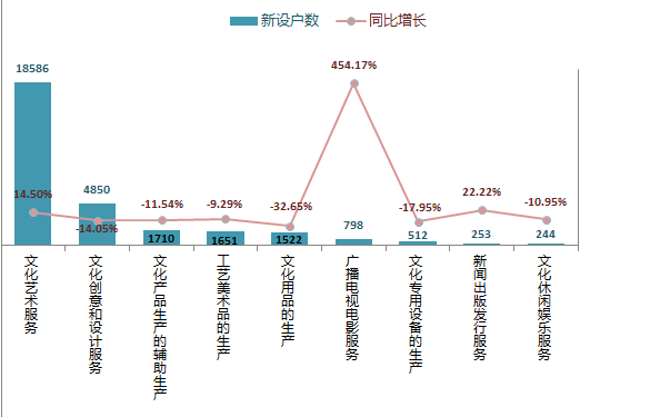 2015年,文化及相关产业新设企业中,新设户数排名前三位的是文化艺术服务类企业、文化创意和设计服务类企业、文化产品生产的辅助生产类企业,合计占全市文化及相关产业新设企业户数的82.92%。其中,文化艺术服务类企业新设18,586户,同比增长14.50%;文化创意和设计服务类企业新设4,850户,同比降低14.05%;文化用品的生产类企业新设1,710户,同比降低11.54%。